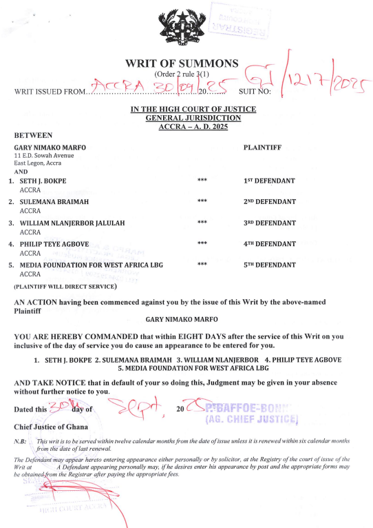 The writ of summons, issued from the High Court in Accra on September 30, 2025, names Seth J. Bokpe, a journalist with Fourth Estate, Sulemana Braimah, Executive Director for MFWA, William Nlanjerbor Jalulah, Philip Teye Agbove, and the Media Foundation for West Africa as defendants in the case.