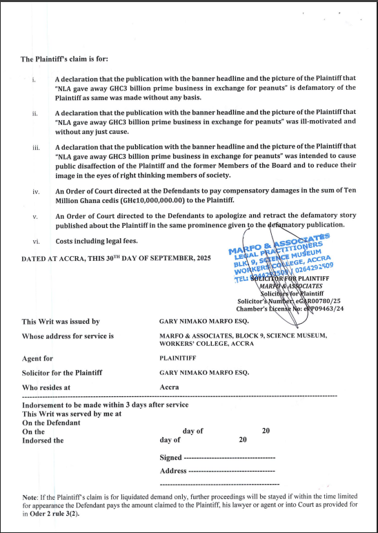 Mr. Nimako, the plaintiff, is seeking GHS10 million in compensatory damages, alongside a public retraction and apology with the same level of prominence as the original story.